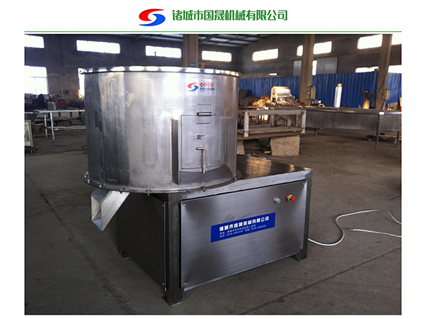 該機用于豬蹄、豬耳、豬鼻等去毛后的去黃皮、黑皮的工作和去除附著在表面余毛雜物等工作。本機通過減速機帶動甩盤轉動,使物料在筒內(nèi)高速旋轉碰撞、摩擦,從而實現(xiàn)脫黑皮和打毛的要求。