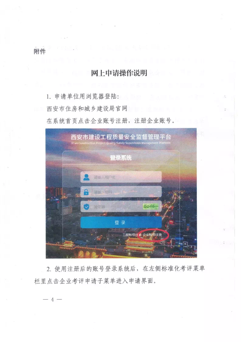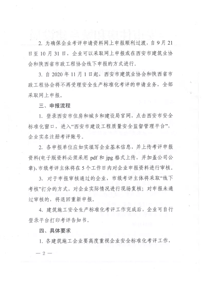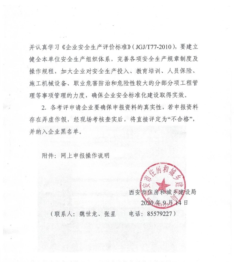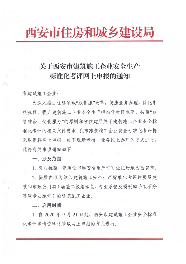 “ 9月15日,西安市住房和城鄉(xiāng)建設(shè)局發(fā)布關(guān)于西安市建筑施工企業(yè)安全生產(chǎn)標準化考評網(wǎng)上申報的通知。”
